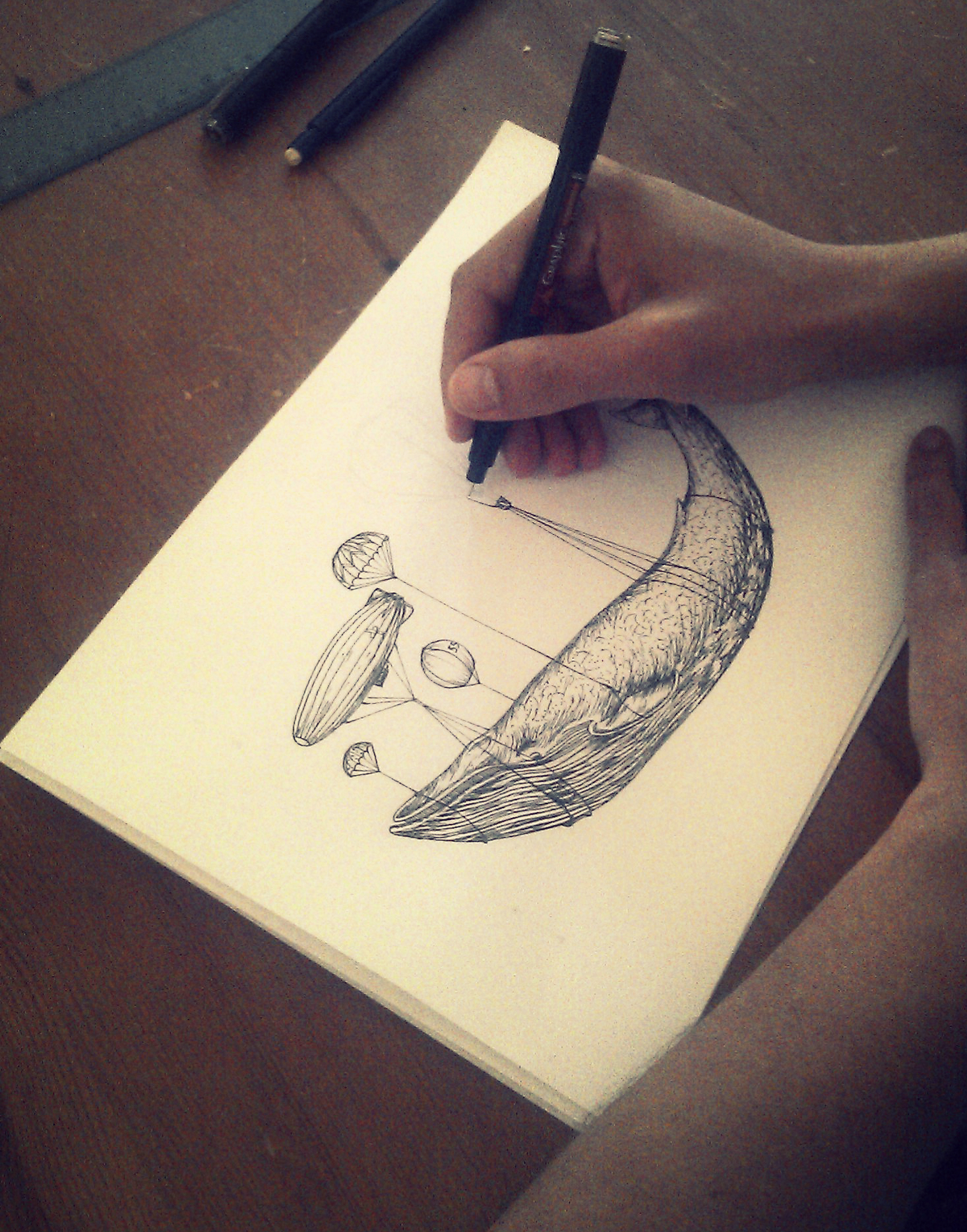 " I wanted to create something melancholy for the album, but also something quite ethereal and panoramic, as Steve's music has a kind of wide-screen quality about it. We decided it would be best to stay away from tower images, so my idea was to come up with an image that positioned the viewer (or listener) in a high place. In my work, I like to play around with the scale and mass of objects, and to try and make the impossible seem possible, hence the blue whale suspended on balloons and parachutes. I tried a few embellishments such as clouds and a horizon, but soon realised that what made the illustration work was the sense of stillness and silence it seemed to suggest, so I settled for some subtle textures instead. These textures continue through the artwork, and I kept the type faces clean and modern to excentuate the minimalism of the artwork and the music contained therein."